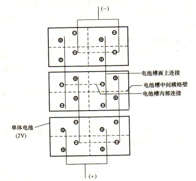 (4)閥控電池正常密封狀態(tài),散熱較差。在浮充狀態(tài)電池內(nèi)為負(fù)壓,所以電池槽壁要加厚,對(duì)2000~3000Ah電池槽的厚度有10mm以上。然而厚度越厚,熱容量越大,越難散熱,這樣將影響電池的電氣性能。因而有些制造廠采用分開槽的方法來(lái)分散槽壁負(fù)壓,以達(dá)到減薄壁厚便于散熱的目的。如將l000Ah電池分成兩格,2000~3000Ah電池分成四格。各槽格極板相互并聯(lián),這樣2000~3000Ah槽厚可減至8~8.5mm。單體電池的電池槽采用分開方式,其串聯(lián)組合方式可用圖1-4表示。